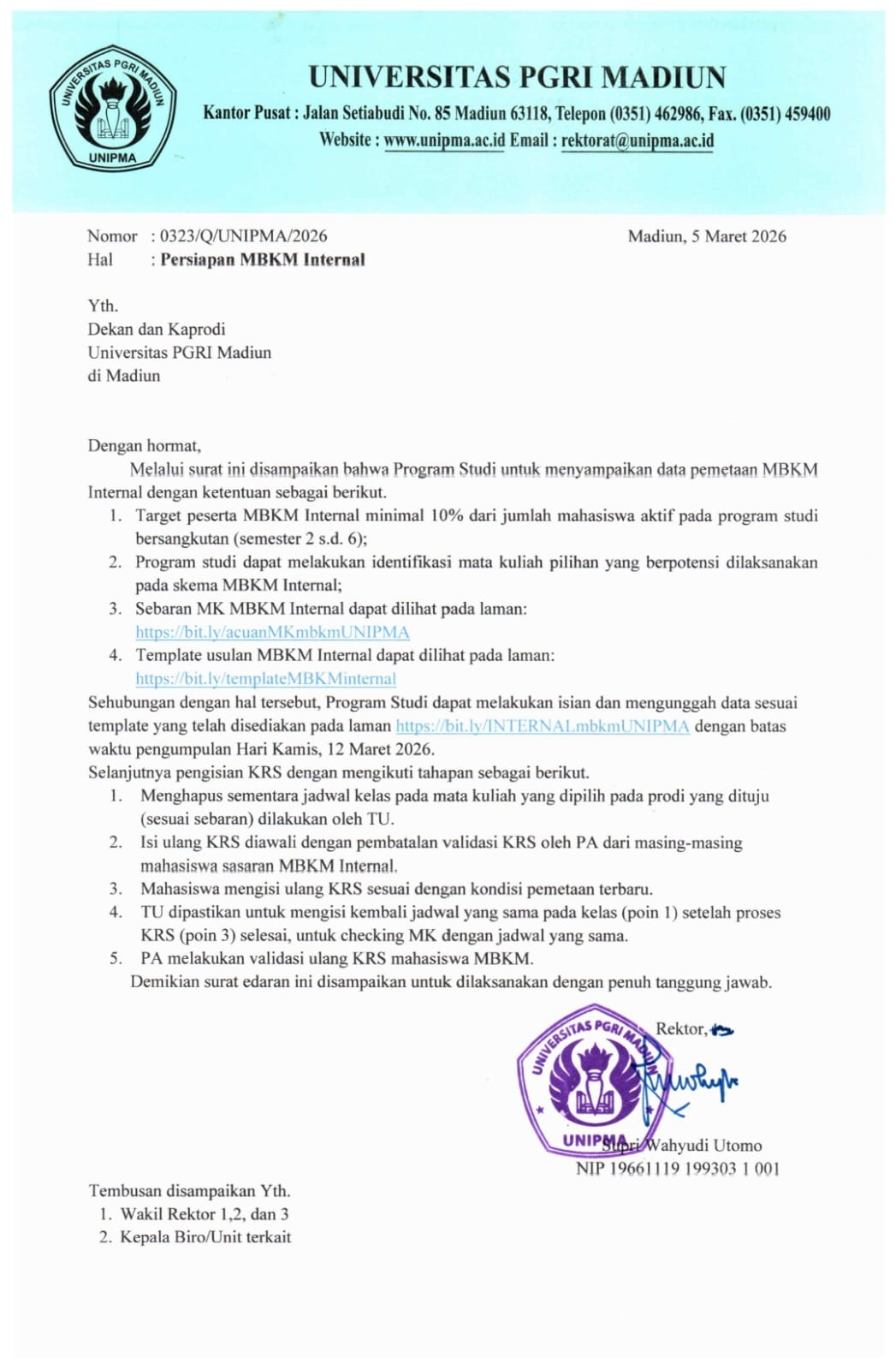 Prodi Hukum FH UNIPMA mengikuti MBKM Internal yaitu dengan kegiatan PMM Internal dengan prodi PPKn, Prodi Manajemen dan Prodi Pendidikan Akuntansi. Dalam hal ini dikonversi dengan 10 SKS